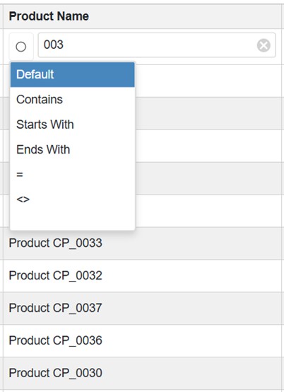- Starts With – Display only results that start with the filter text.